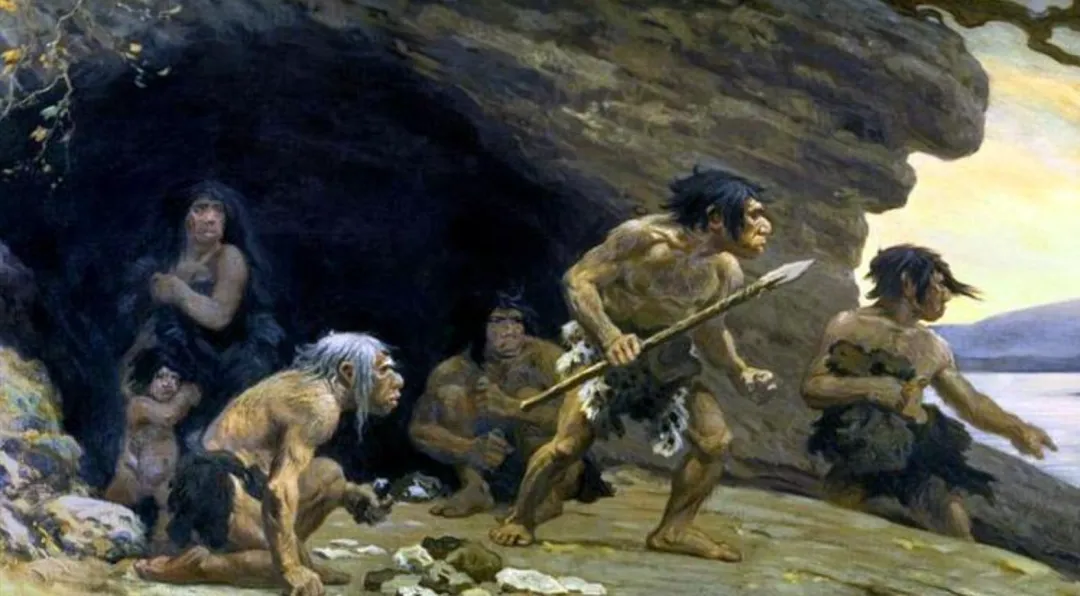 一块石头躺在地上,一个原始人走过来,捡起它,用它砸开了一颗坚果,用它绑在棍子的前面变成了石矛。