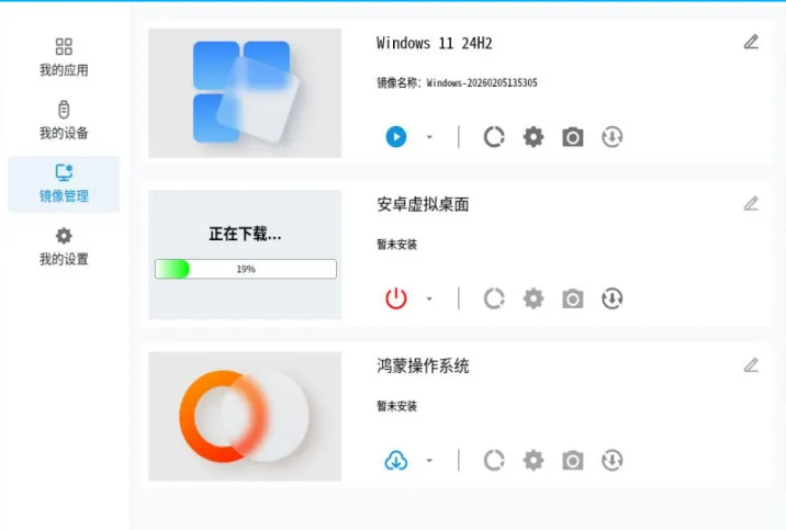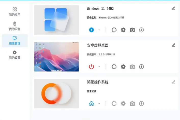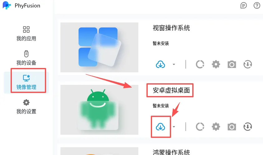 1️⃣找到入口:打开 PhyFusion,点击左侧 【镜像管理】。在 Windows 镜像卡片的下方,你会看到一个 【安卓虚拟桌面】 的区域。