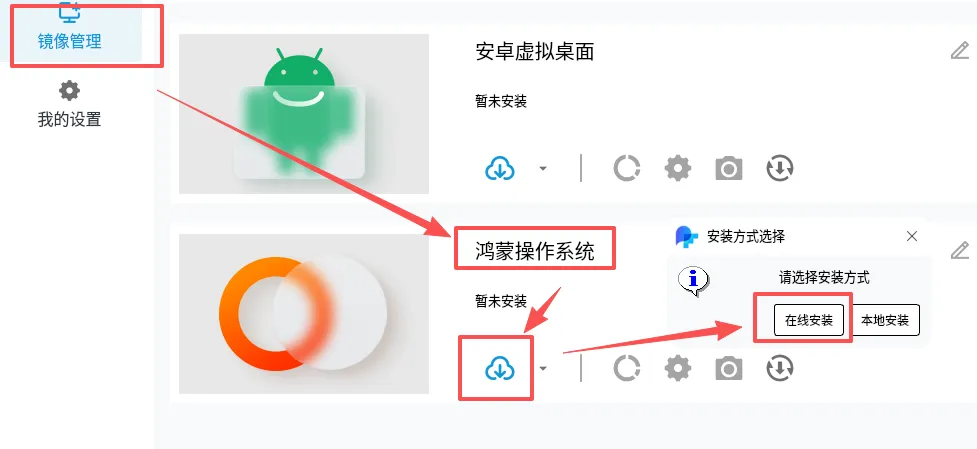 2️⃣一键安装:点击区域内的 【安装】 按钮。软件会提示即将下载安卓镜像包,确认后自动开始联网下载。