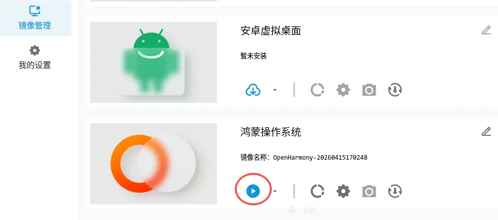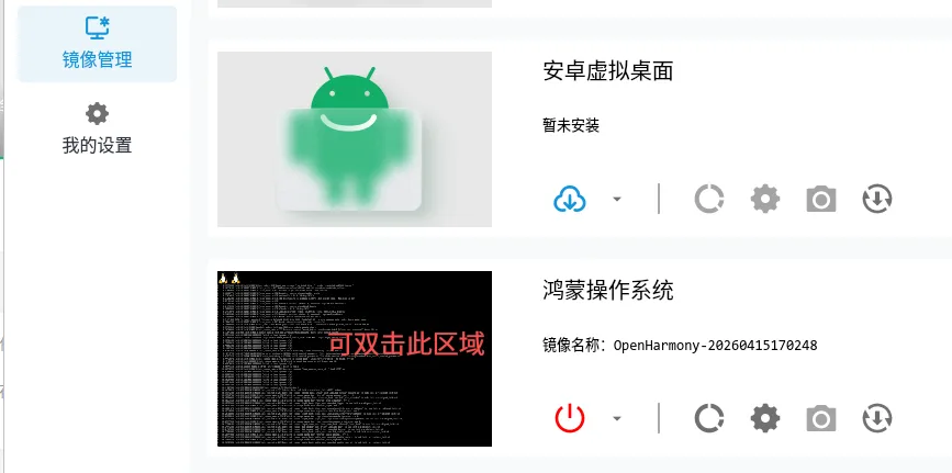 1️⃣在 【镜像管理】 界面,找到 【OpenHarmony 虚拟机桌面】 区域。
