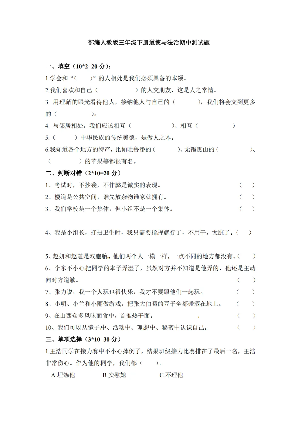 26春三年级下册人教部编版《道德与法治期中测试卷》共2套(附答案)高清电子版