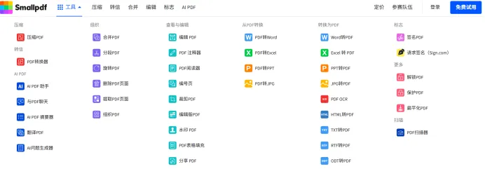 在线使用,完全免费、丰富的PDF处理工具,包括:合并、拆分、压缩、转换、旋转和解锁PDF文件,以及给PDF文件添加水印的工具等。仅需几秒钟即可完成。主打一个速度快。