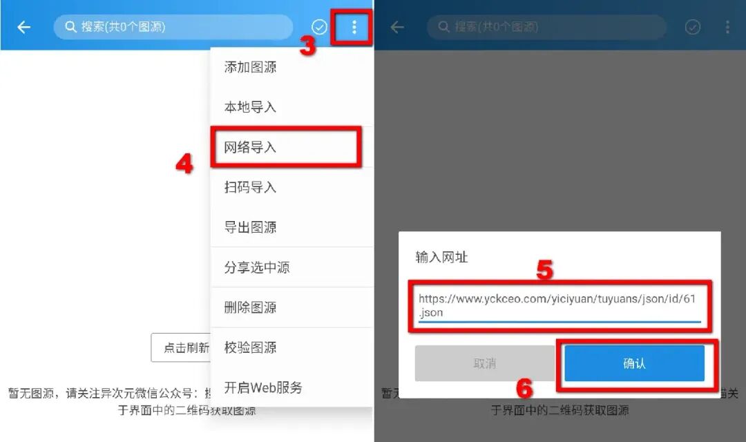 再点击右上角三个点,点击【网络导入】,然后将船长分享的图源地址复制进来,点击【确定】就导入成功了