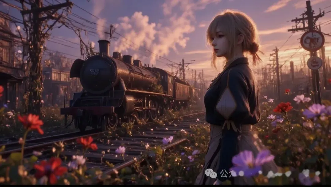 CG 动画风格,黄昏时分,废弃铁路场景,一列被藤蔓覆盖的复古列车停靠在铁轨上,画面右侧有一位背对镜头、穿着细节丰富复古服饰、扎低马尾的年轻女性。前景是繁茂艳丽、色彩丰富(红色、紫色等)的花朵,背景天空呈现粉紫色渐变的夕阳余晖,电线与老旧电线杆交错且缠绕藤蔓,旁边有破败建筑和圆形交通标志牌,营造出荒废又奇幻诗意的氛围。