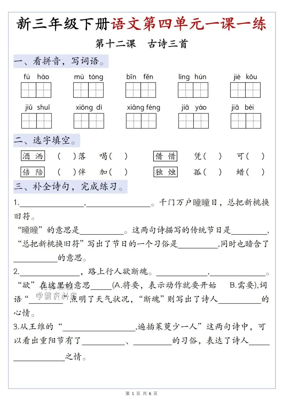 三年级下册语文|第四单元一课一练(可下载打印)