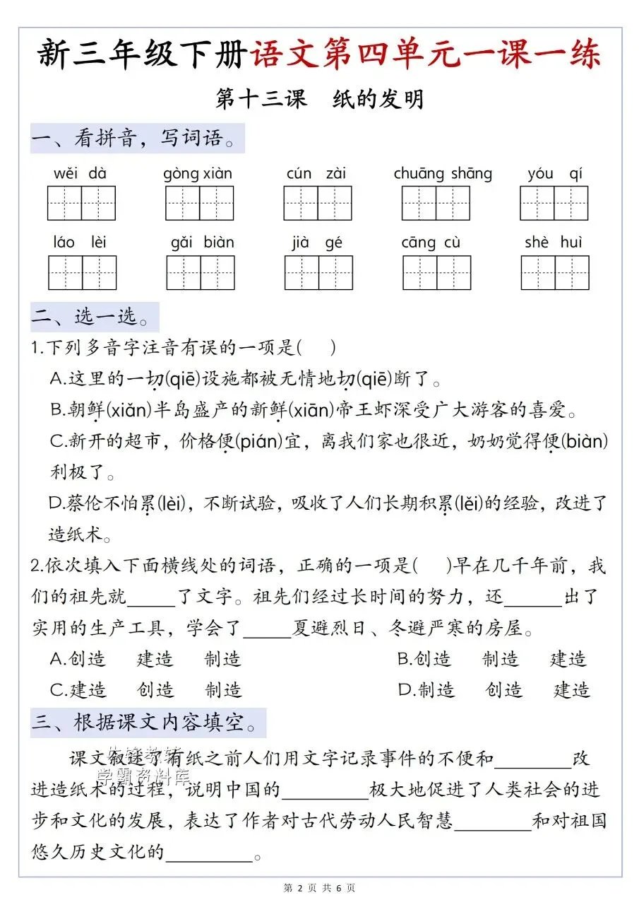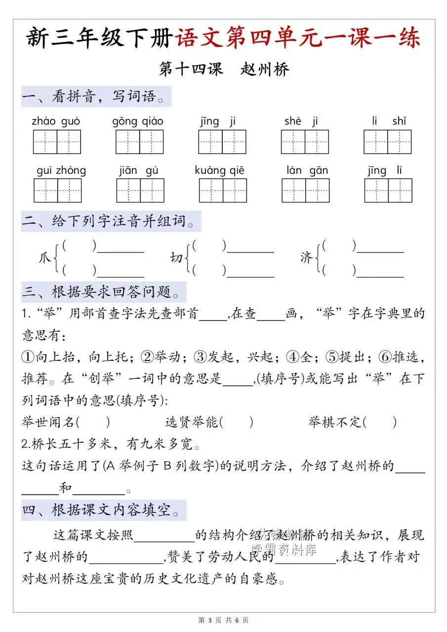 涵盖《古诗三首》《纸的发明》《赵州桥》《一幅名扬中外的画》及语文园地四,题型含看拼音写词语、选字填空、诗句补全、课文理解、传统文化知识等,并附完整参考答案,用于单元同步练习。