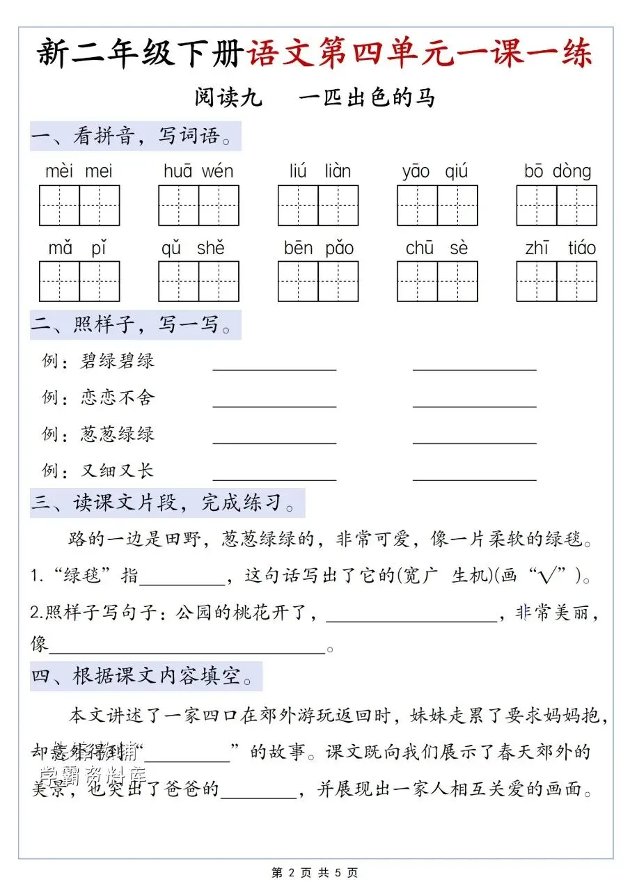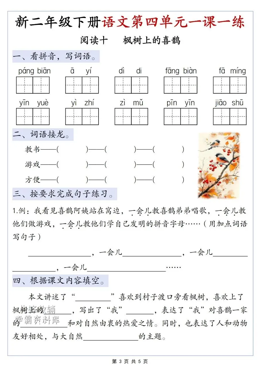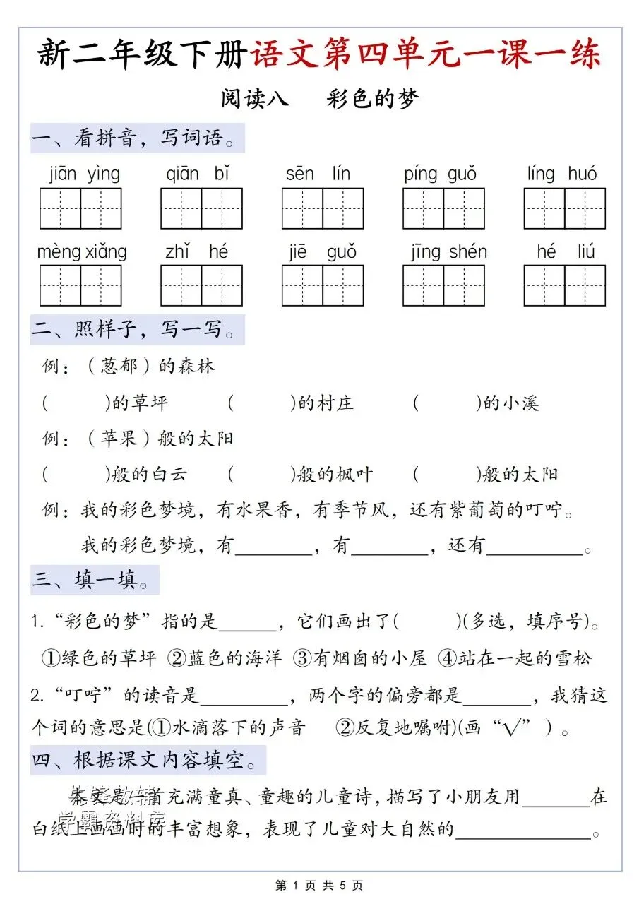 包含《彩色的梦》《一匹出色的马》《枫树上的喜鹊》和语文园地四的练习题,题型有看拼音写词语、仿写、句子练习、课文内容填空、诚信名言运用等,并附完整参考答案,用于同步巩固学习。