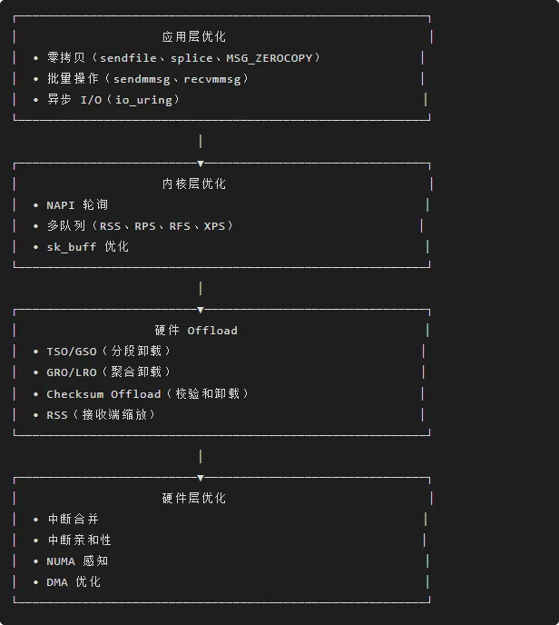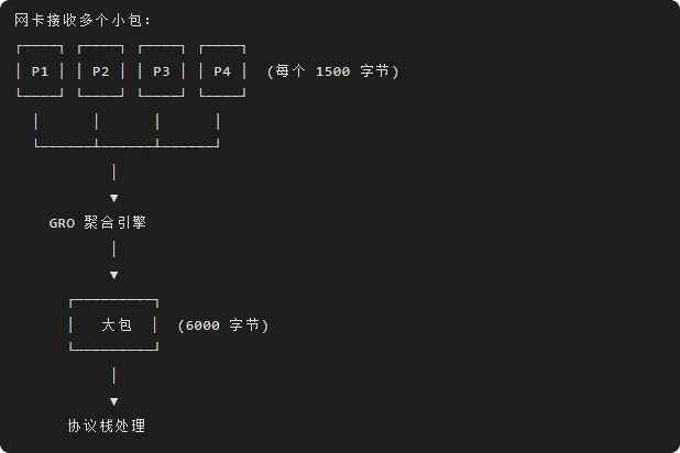 发送方向:应用 → TCP → IP → TSO/GSO → 网卡 ↓ 延迟分段,减少处理接收方向:网卡 → GRO → IP → TCP → 应用 ↓ 聚合小包,减少处理