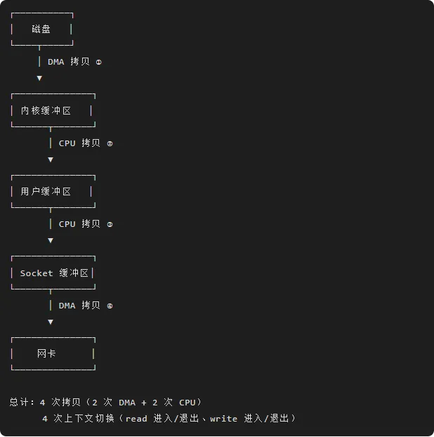 /* 传统方式:4 次拷贝,4 次上下文切换 */char buf[8192];/* 1. read():磁盘 → 内核缓冲区 → 用户缓冲区 */int fd = open("file.txt", O_RDONLY);ssize_t n = read(fd, buf, sizeof(buf)); /* 2 次拷贝 *//* 2. write():用户缓冲区 → socket 缓冲区 → 网卡 */write(sockfd, buf, n); /* 2 次拷贝 */