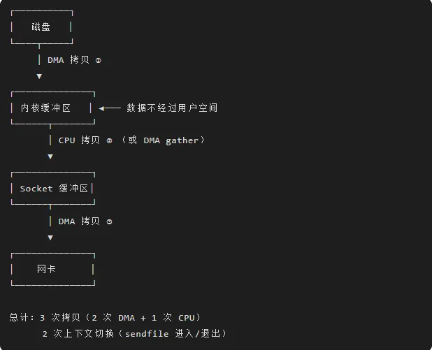 sendfile() 在内核空间直接传输数据,避免用户空间拷贝。