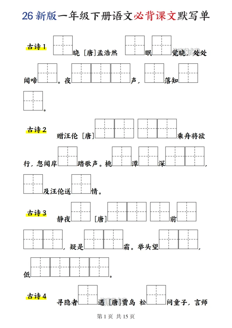 这里是26新版一年级下册语文必背课文默写单的完整版分享!一共15页,可直接下载打印,期中、期末备考必备,赶紧收藏起来!