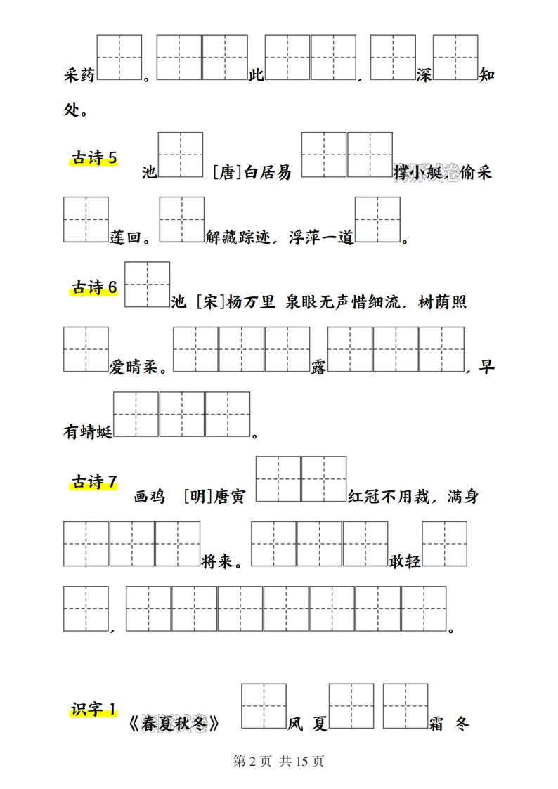 ✅ 必背古诗:收录《春晓》《赠汪伦》《静夜思》《寻隐者不遇》《池上》《小池》等,逐字填空,规范默写,完美还原考试原题。