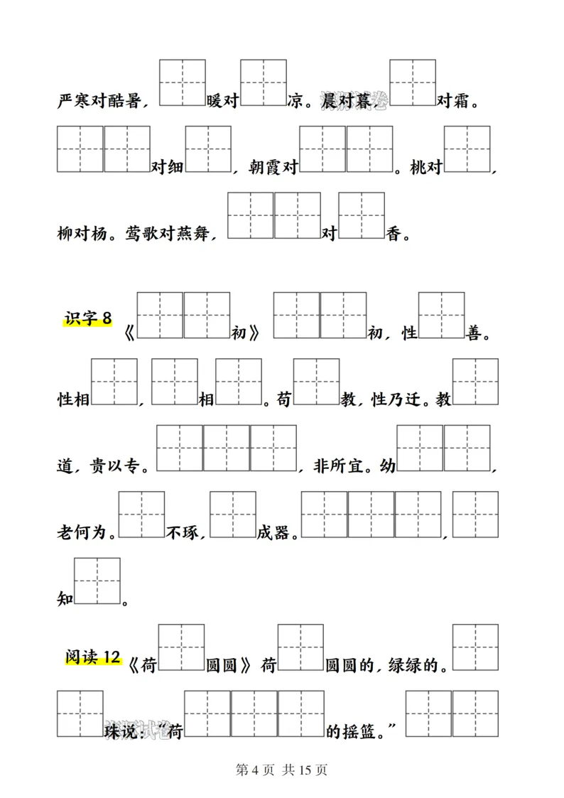 一年级是语文积累的关键期,每天花10分钟练一练、背一背,期中考试就能轻松拿高分!需要的老师家长,赶快打印出来给孩子安排起来吧!