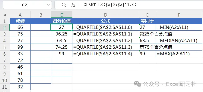 今天这个函数,对于一般办公的小伙伴可能有些难理解,统计学属性有点强,不过如果能在数据报告里加上这些分段统计,绝对是个加分项,一起来看看吧。Quartile函数的作用是返回数据集的四分位数。四分位数通常用于在销售额和测量数据中对总体进行分组。