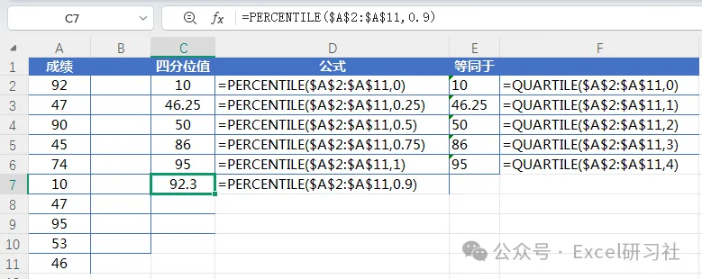 要多努力,才能成为跻身前10%.wps 百分位函数Quartile和percentile用法区别.
