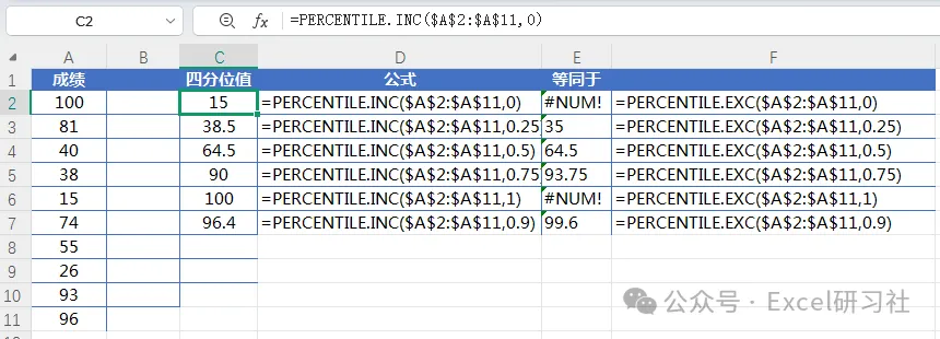 技巧3:percentile.inc和percentile.exc用法区别