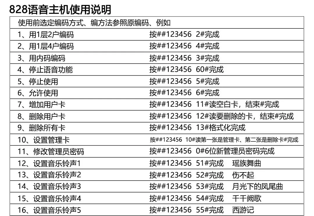 修改开锁密码:##123456 20# xxxx #xxxx是4位开锁密码主机开锁:#8888 xxxx