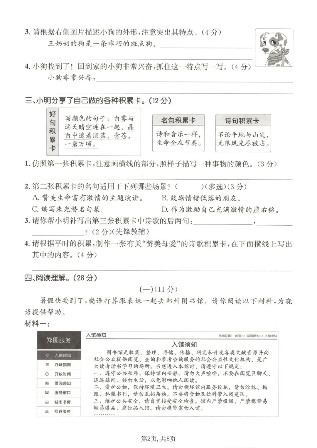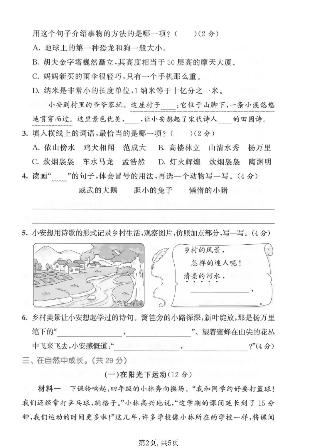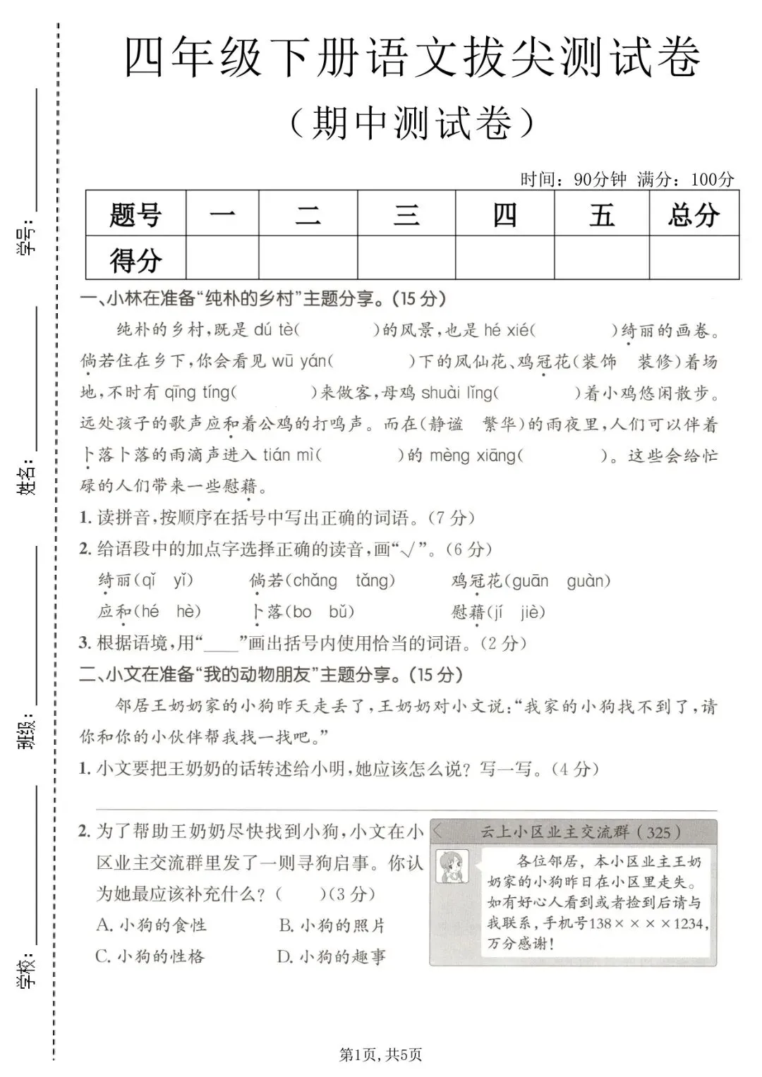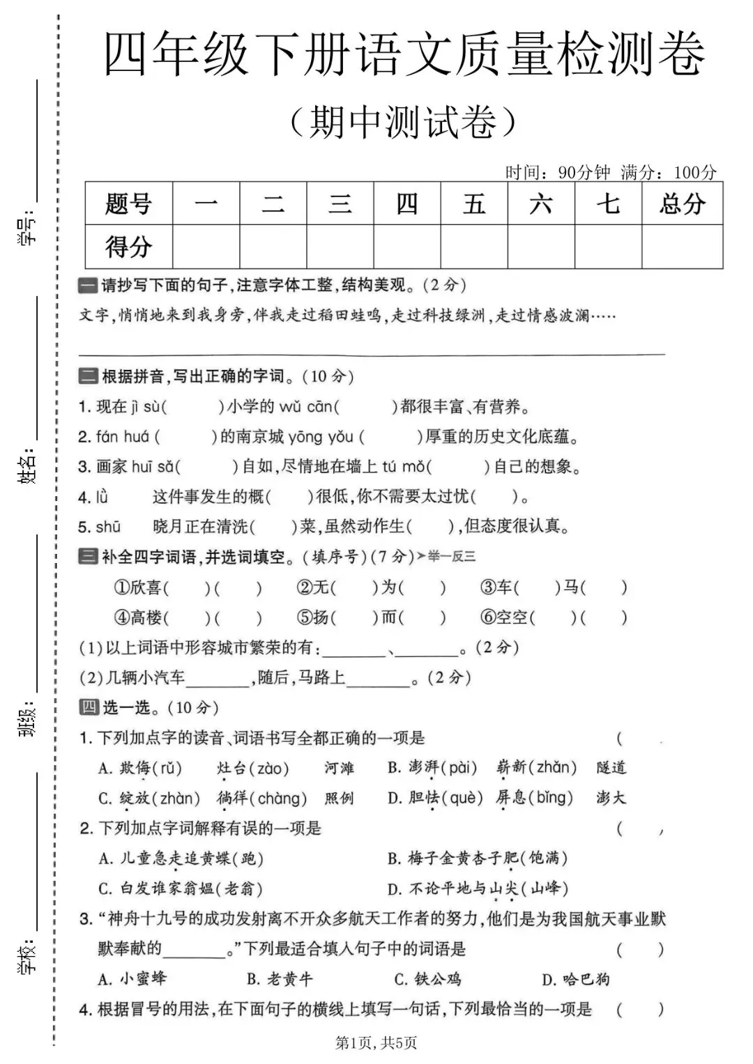 四年级下册语文《期中测试卷》5套,一键免费下载