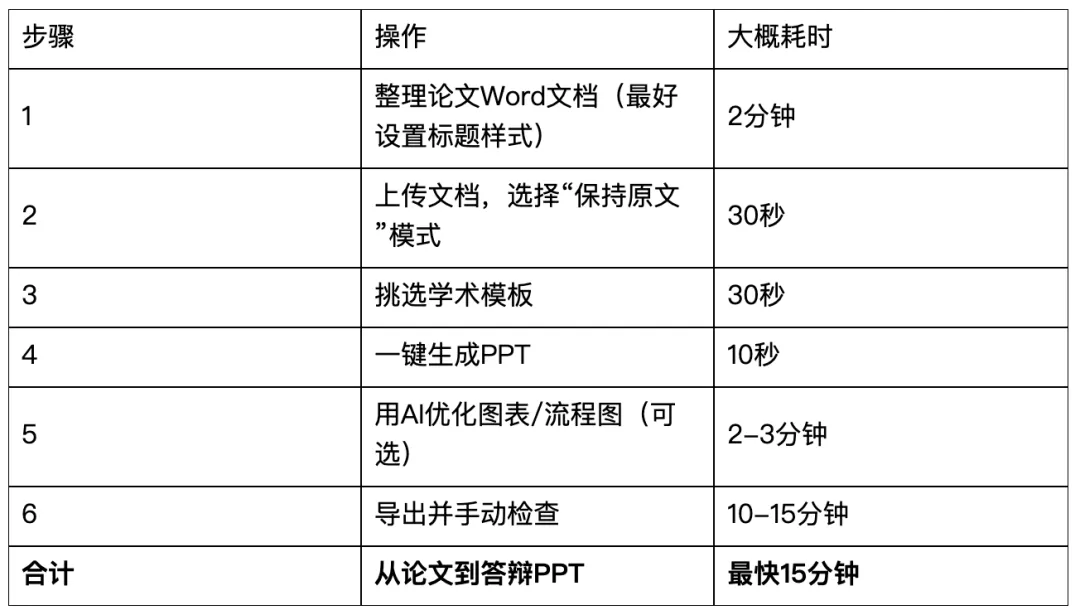通常只需要微调十几分钟,就能拿去答辩了。比从头做PPT至少省下三四个小时。