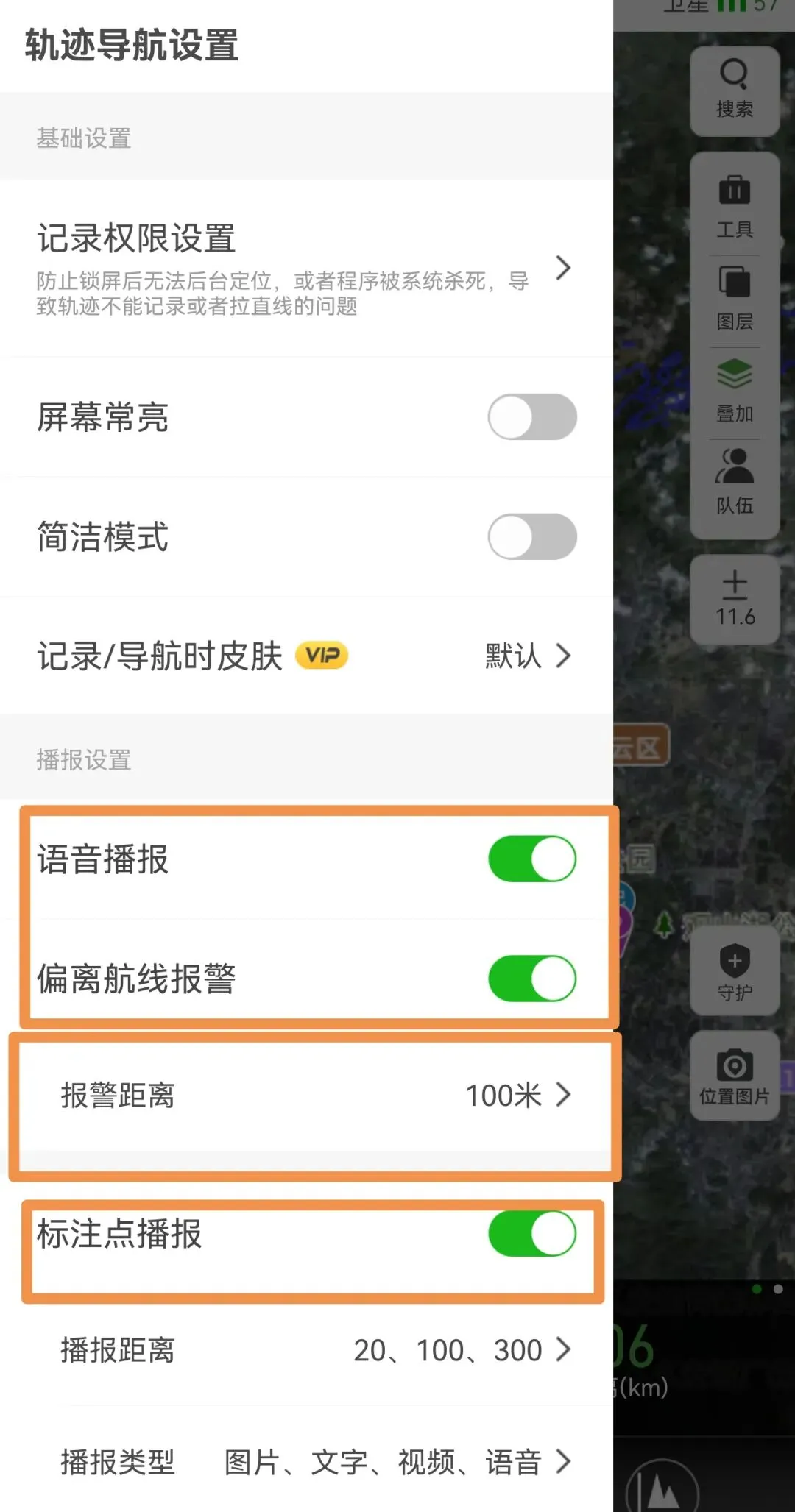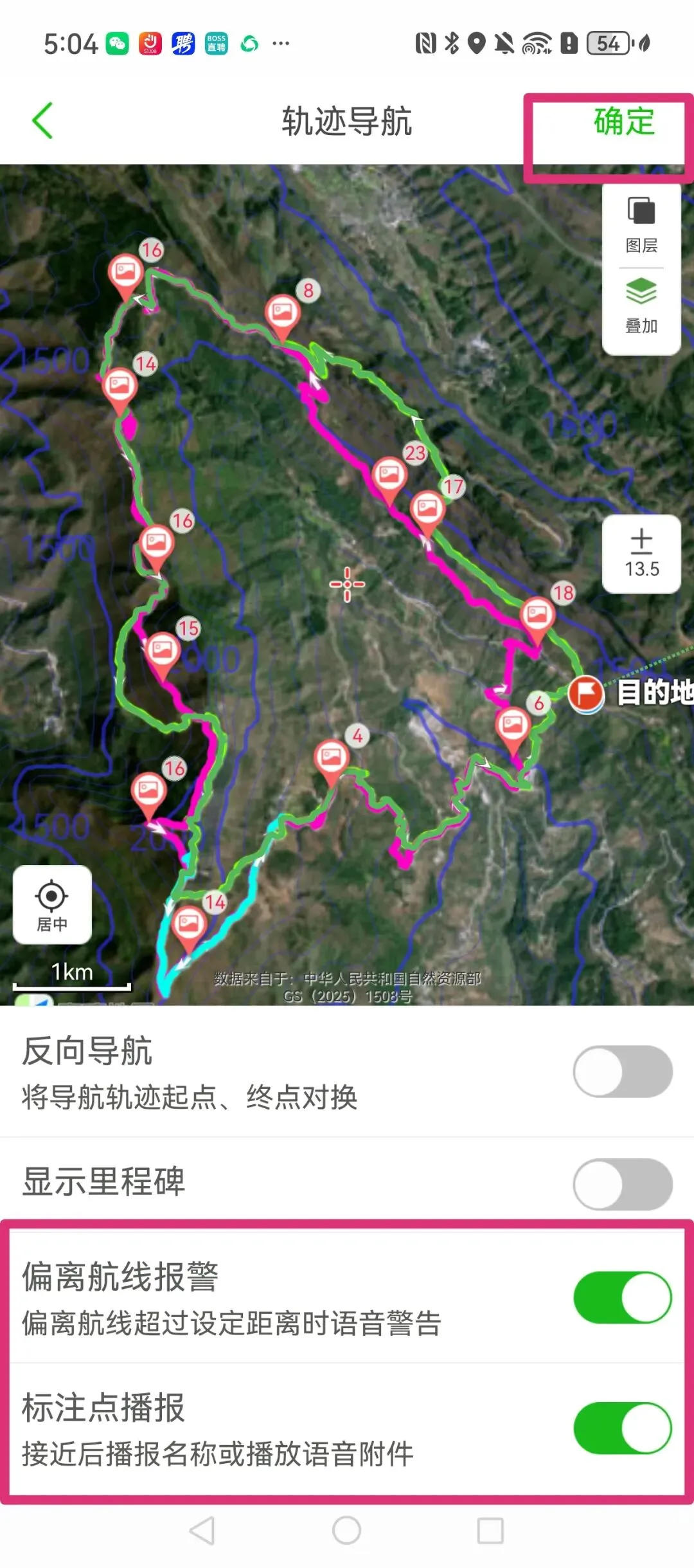 2. 点击“之前已下载的轨迹”,可选择“反向导航”“偏离预警”“标注点播报”,点击右上角“确定”,正式进入导航界面;