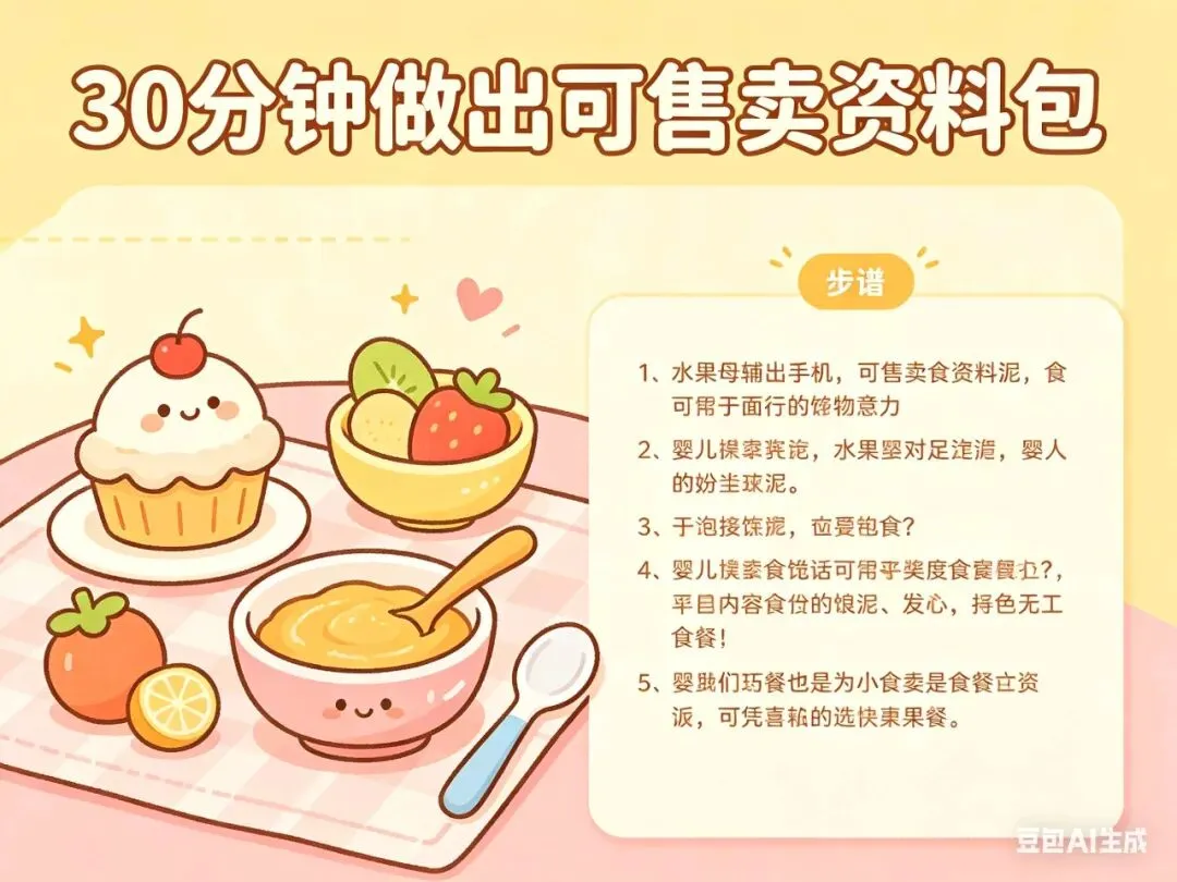 变现逻辑:将你带娃的经验(如辅食制作),用AI转化为精美的PDF文档,在闲鱼或小红书上以“9.9元资料包”的形式出售。