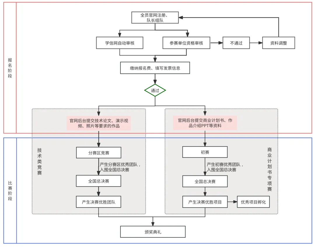 技术类竞赛和商业计划书专项赛相互独立,组队、报名、评审、奖励工作均分开进行,互不影响。