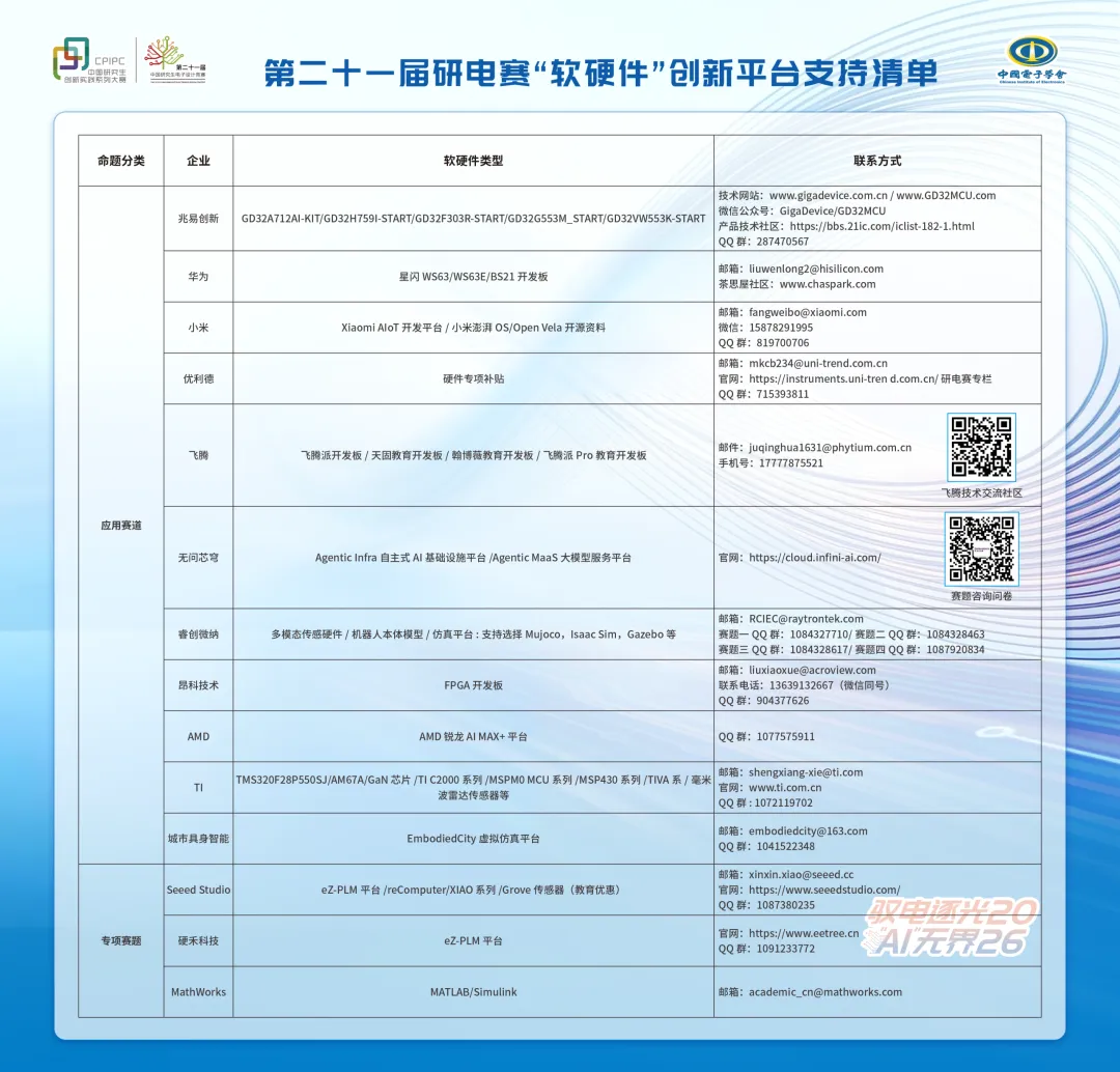 本届竞赛兆易创新、华为、小米、优利德、飞腾、无问芯穹、睿创微纳、昂科技术、AMD、TI、城市具身智能共11家单位在应用赛道中设立命题,此外还设有MathWorks、SeeedStudio、硬禾科技(AI智能体)、光载信息、通感算智融合与数智化应用5个专项赛题。专项赛题作为技术类竞赛的一部分,可与开放赛道、应用赛道同时报名。