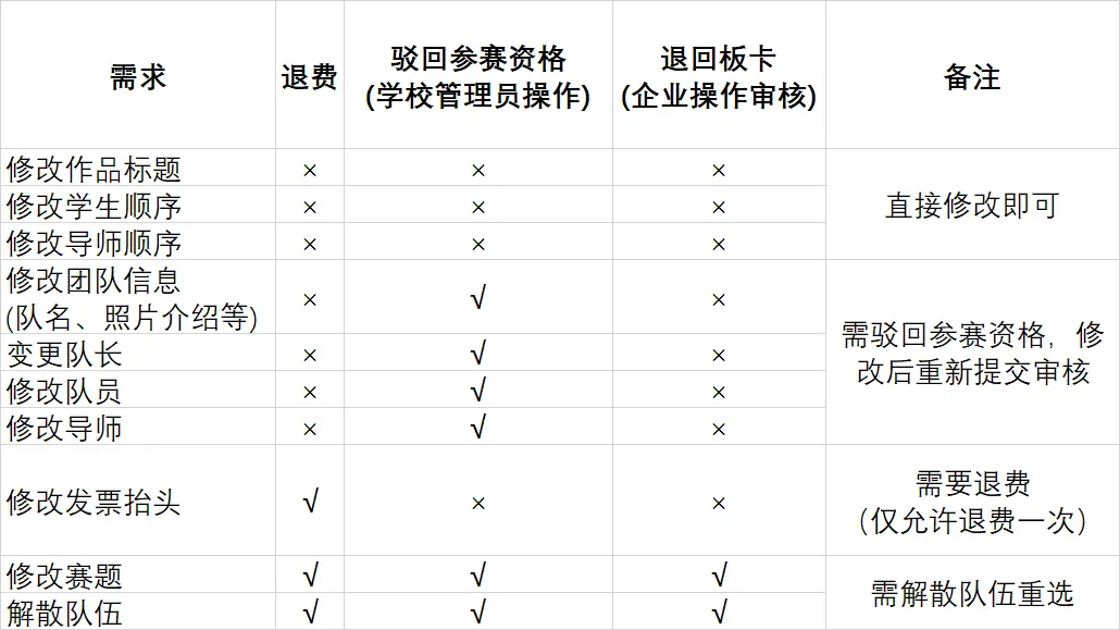 缴费后能否修改队名 / 作品标题 / 赛题方向 / 命题类别 / 更换赛题 / 队员 / 学生顺序 / 导师顺序/作品名称 / 团队照片 / 发票抬头?