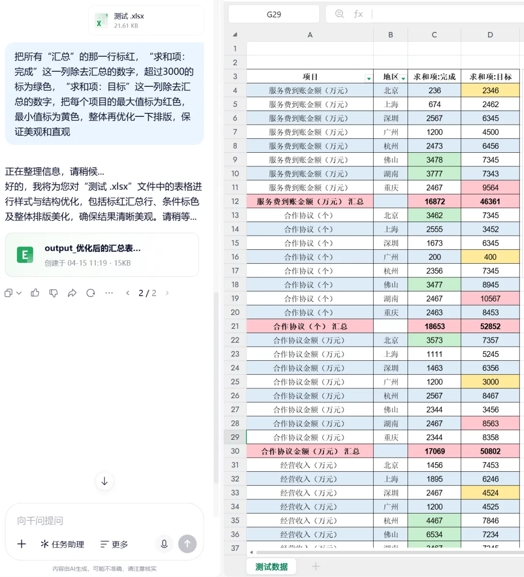 可以看到千问完全理解了用户的意图,并按照要求改好了表格,在没有提示词规定的情况下,并没有使用高亮高饱和的颜色,而是贴合原表格的淡蓝色选择了饱和度较低的红绿黄色,不仅听得懂人话还聪明。