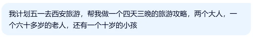 除了适用于工作,生活中这也是一个很实用的工具,这就不得不提多轮对话整理成表格了。正好快到五一了,很多小伙伴都有出去旅游的打算,但旅游可不是出门买菜,机酒、景点门票、开放时间、路线规划都是学问,假期出门更是人山人海,更别说家里还有老人小孩,怎么说也得做一个细致的攻略,这个时候就可以把问题抛给千问: