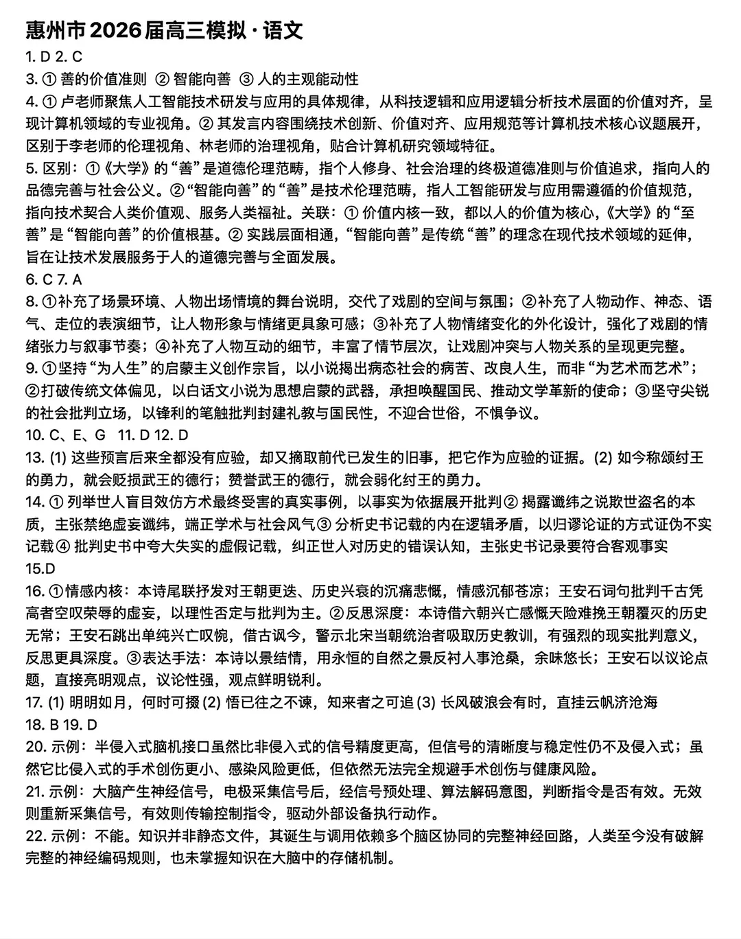 2026韶关/惠州二模试题答案