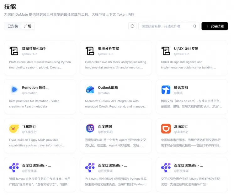 在个性化能力方面,搭子DuMate上线了技能广场,用户除内置技能外,可浏览并安装更多精选技能,按需扩展工作台能力;同时新增每日总结功能,搭子DuMate可基于记忆与当日信息自动生成个人日报,帮助用户沉淀工作进展。