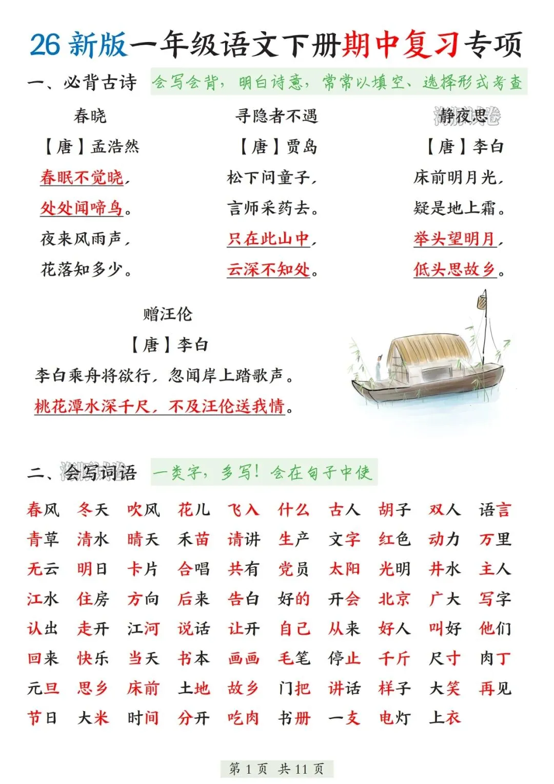 可下载丨26新一年级(下)语文期中复习专项,电子版可打印