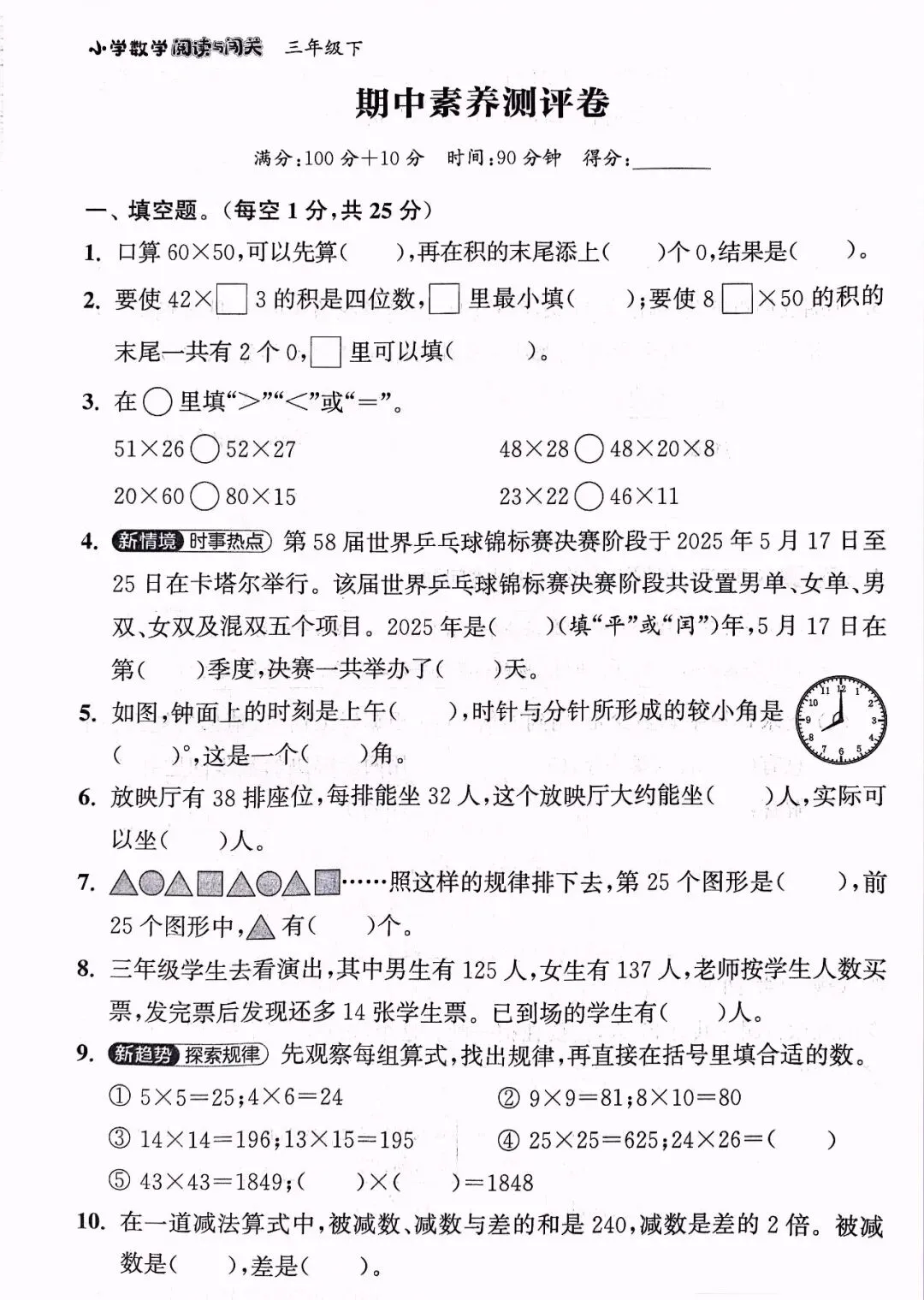 大家好,我是多雅妈妈,今天分享的是26新三年级下册数学期中测试卷,考点精准,高效备考,有答案电子版可打印