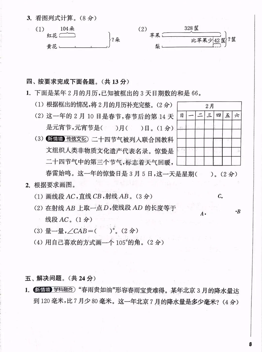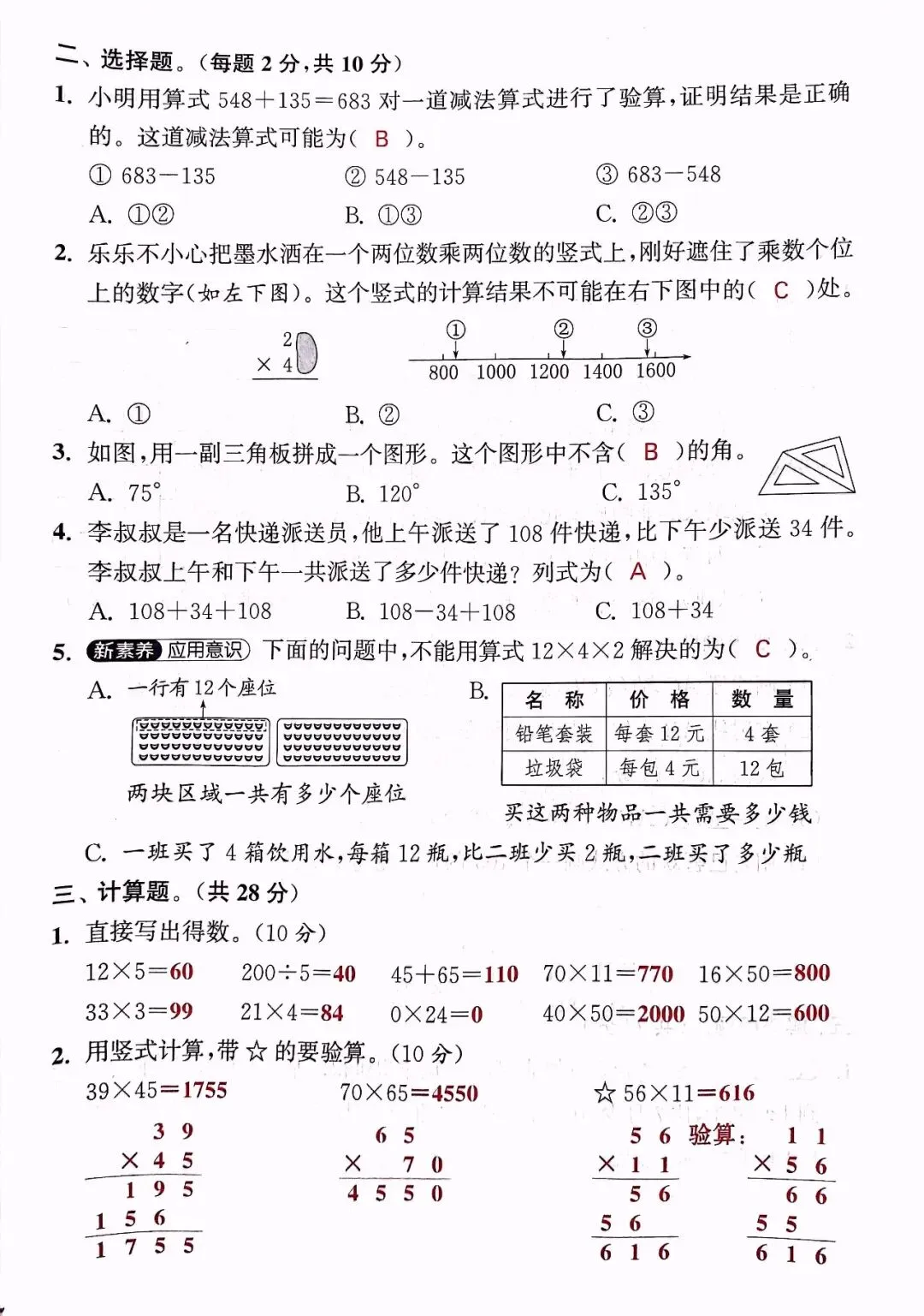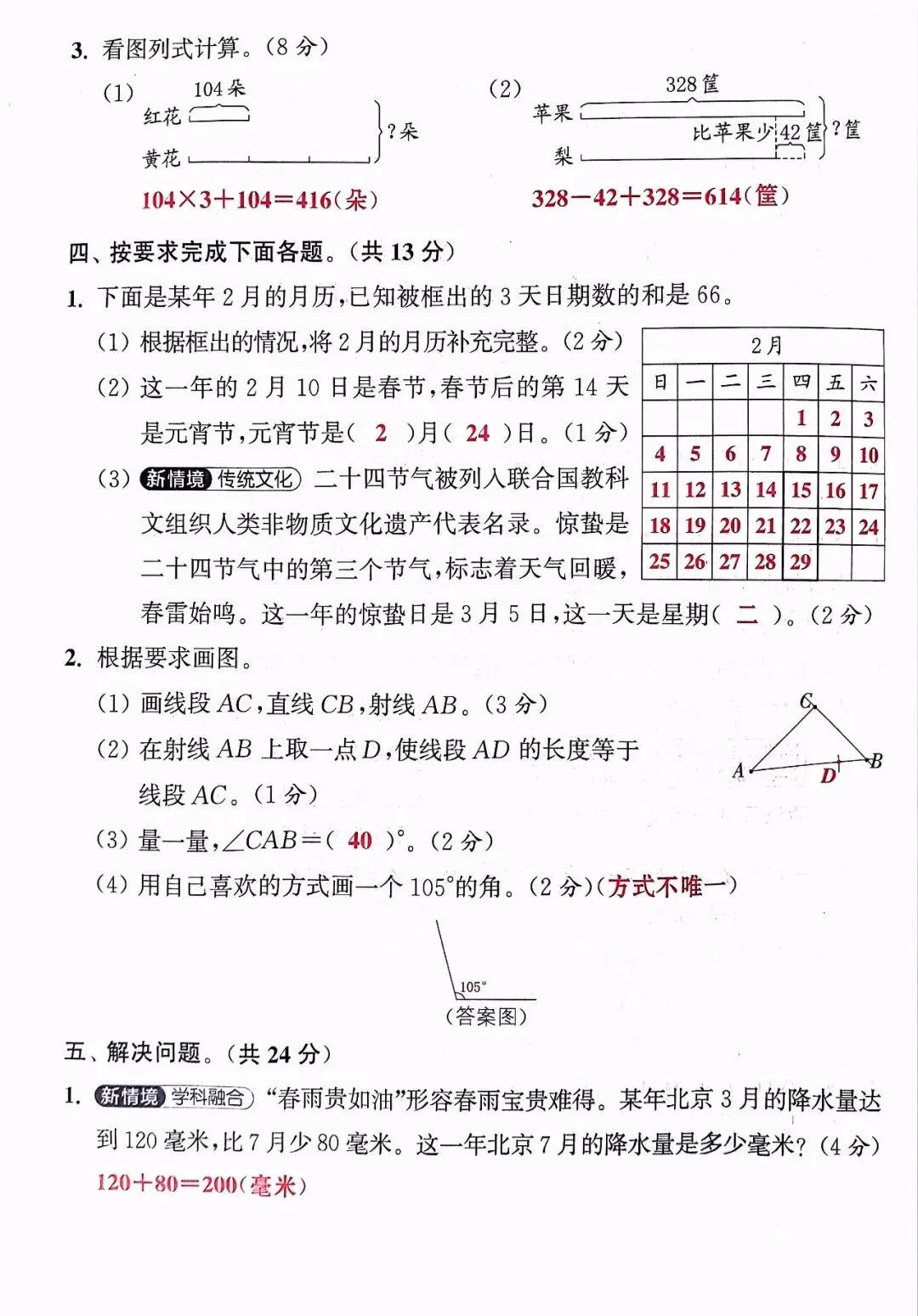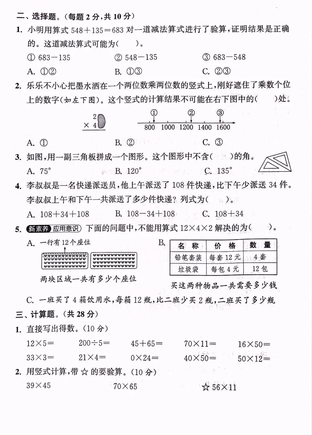 26新三年级下册数学期中测试卷,高清电子版可打印