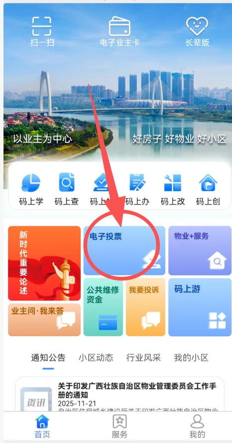 四、登录系统,点击“首页”->“物业服务”进入到南宁市物业服务管理平台,点击“电子投票”。