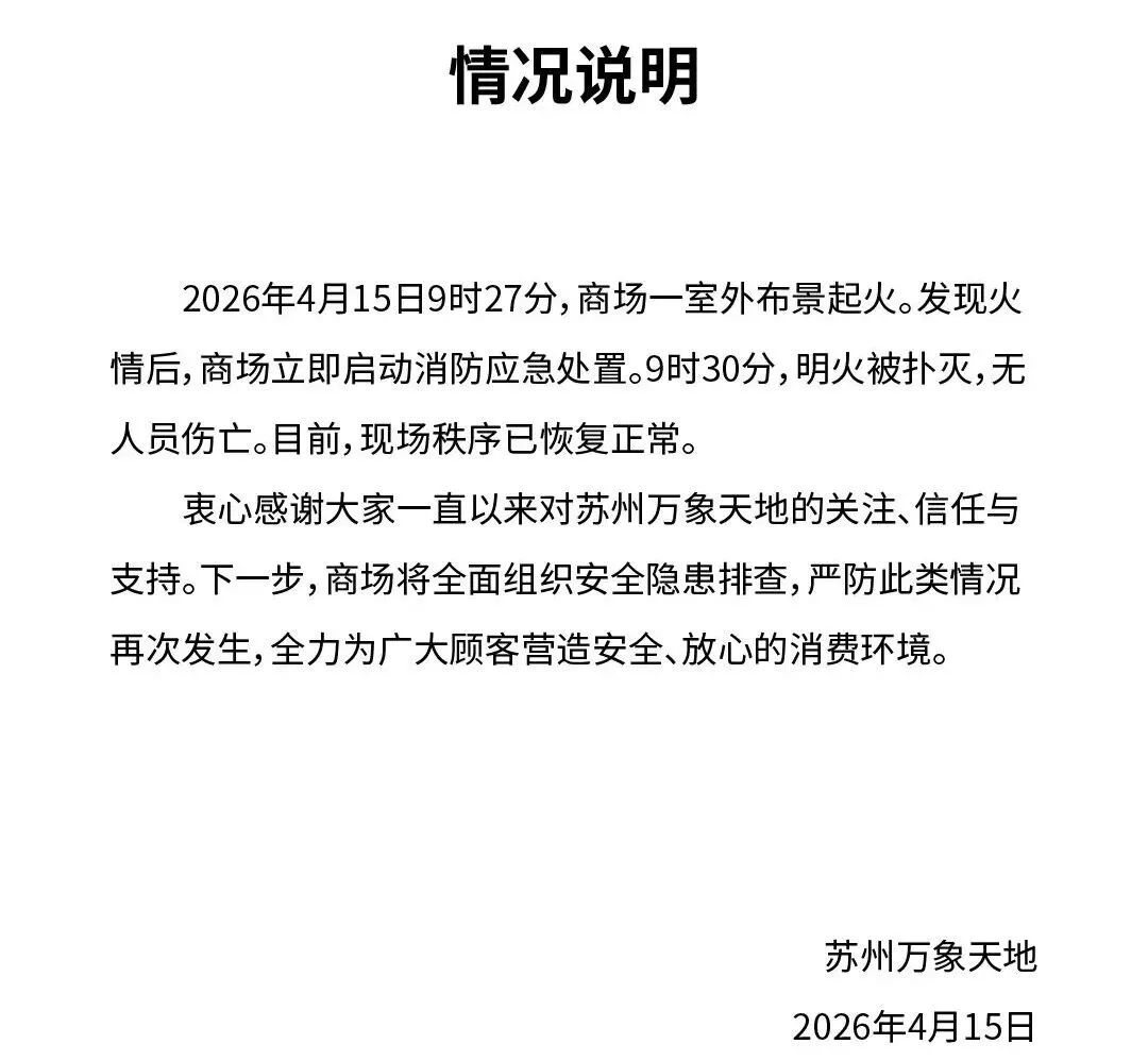 2026年4月15日9时27分,商场一室外布景起火。发现火情后,商场立即启动消防应急处置。9时30分,明火被扑灭,无人员伤亡。目前,现场秩序已恢复正常。