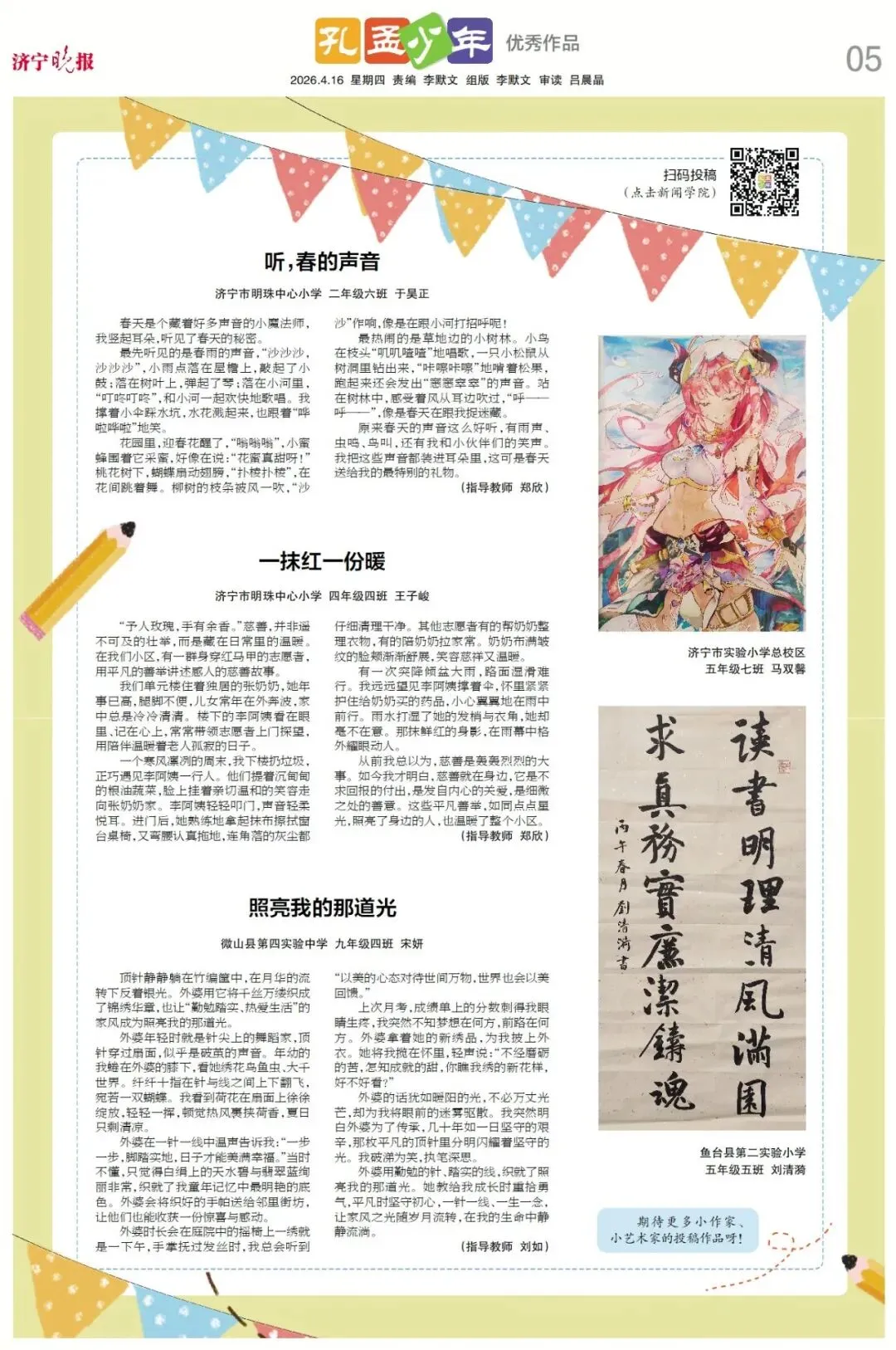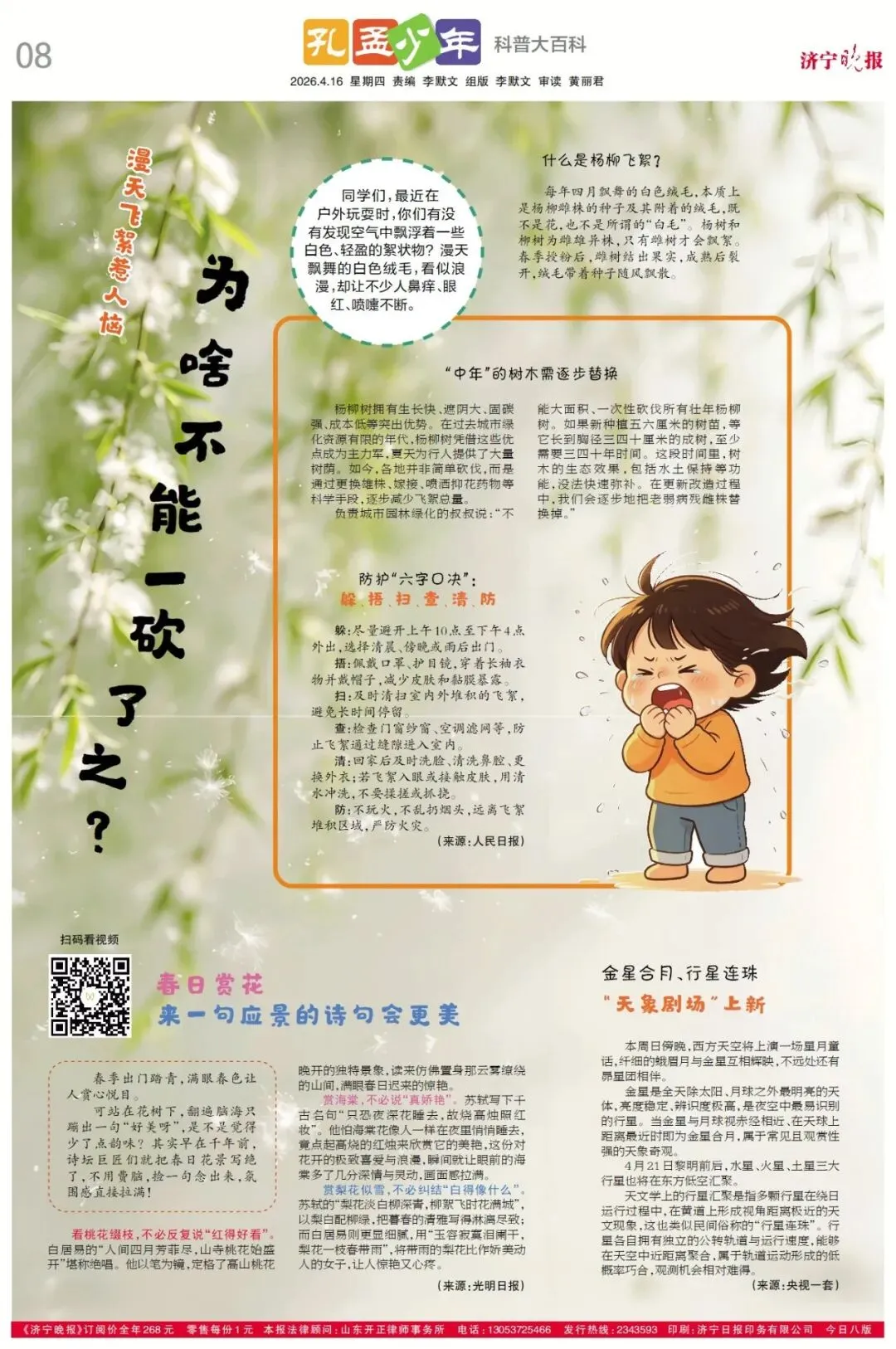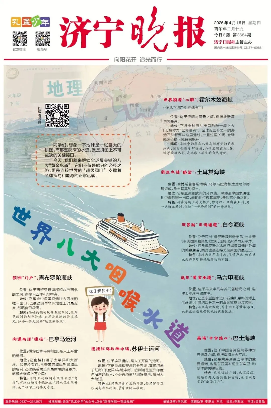 济宁晚报《孔孟少年》周刊电子版(4.16) 叮咚!新一期内容请查收!📦 同学们 先把地球仪转一转 看看世界上那些大名鼎鼎的 “咽喉水道”有多神奇 再戴上护目镜 揭秘废旧手机里藏着的“炼金奇迹” 接着拉响警报 翻翻超实用的《安全手册》 最后……阿嚏 漫天飞舞的杨絮柳絮又来捣乱 为什么不能把它们“一砍了之” 走吧,开启今天的奇妙探险—— 不用扫码,这俩视频“偷偷”藏在这里 动一动手指,关注我们呦 制作 |《孔孟少年》爆米花创想营