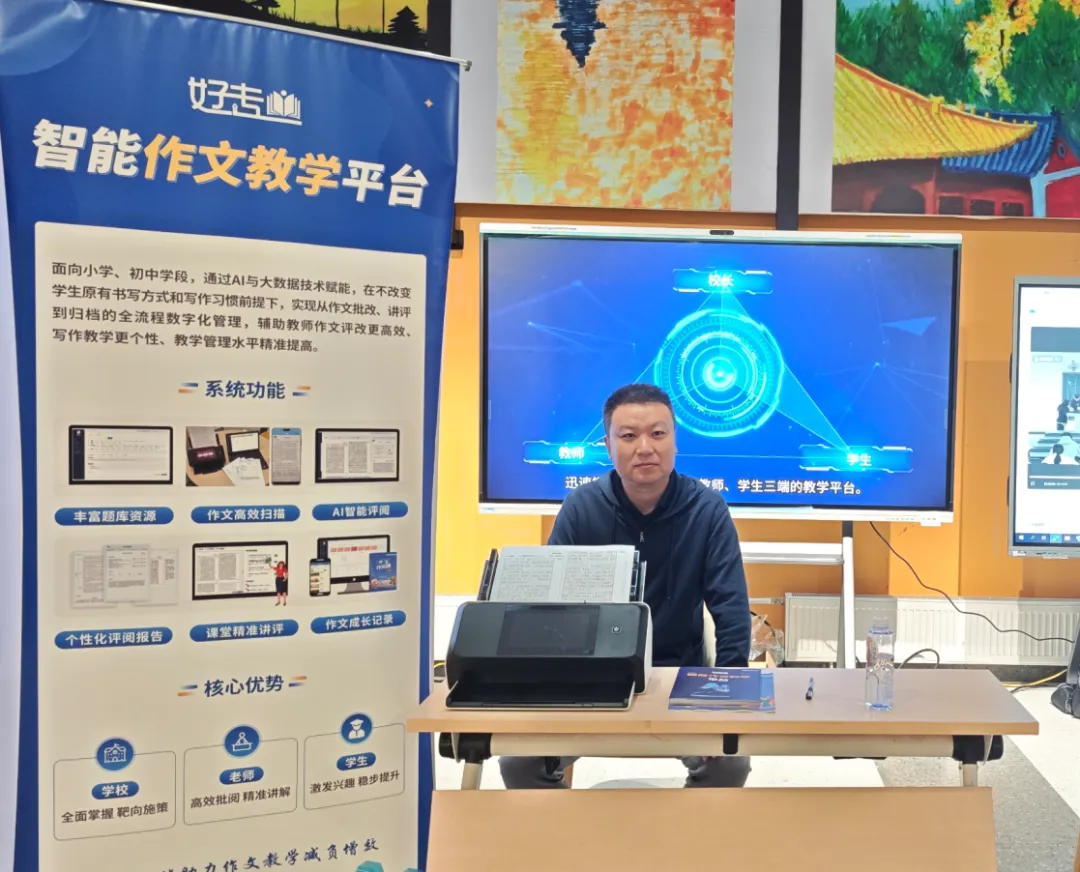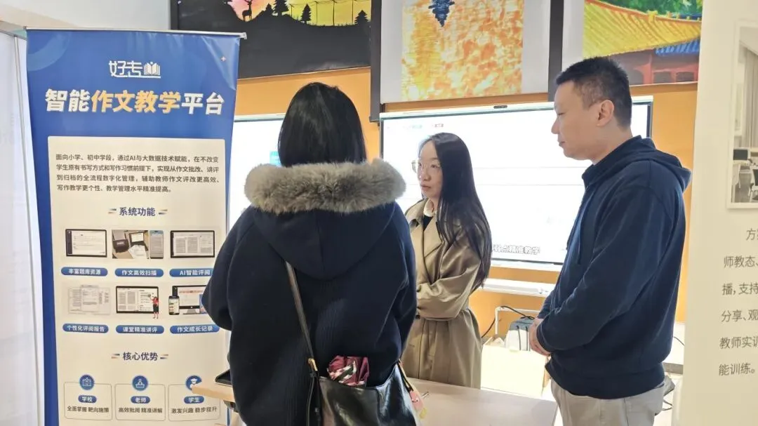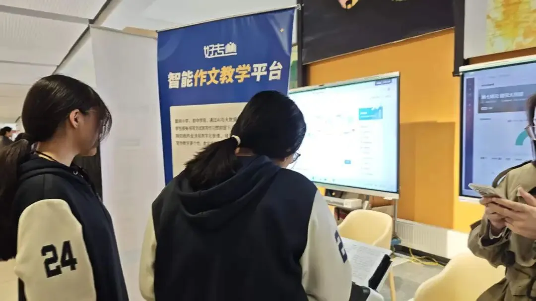 展会现场,和气聚力通过成果展板、数字大屏、产品演示等形式,展示核心AI产品——好专业·AI智能作文教学平台。平台依托AI与大数据技术,助力教师高效完成作文评阅、讲评、归档全流程。