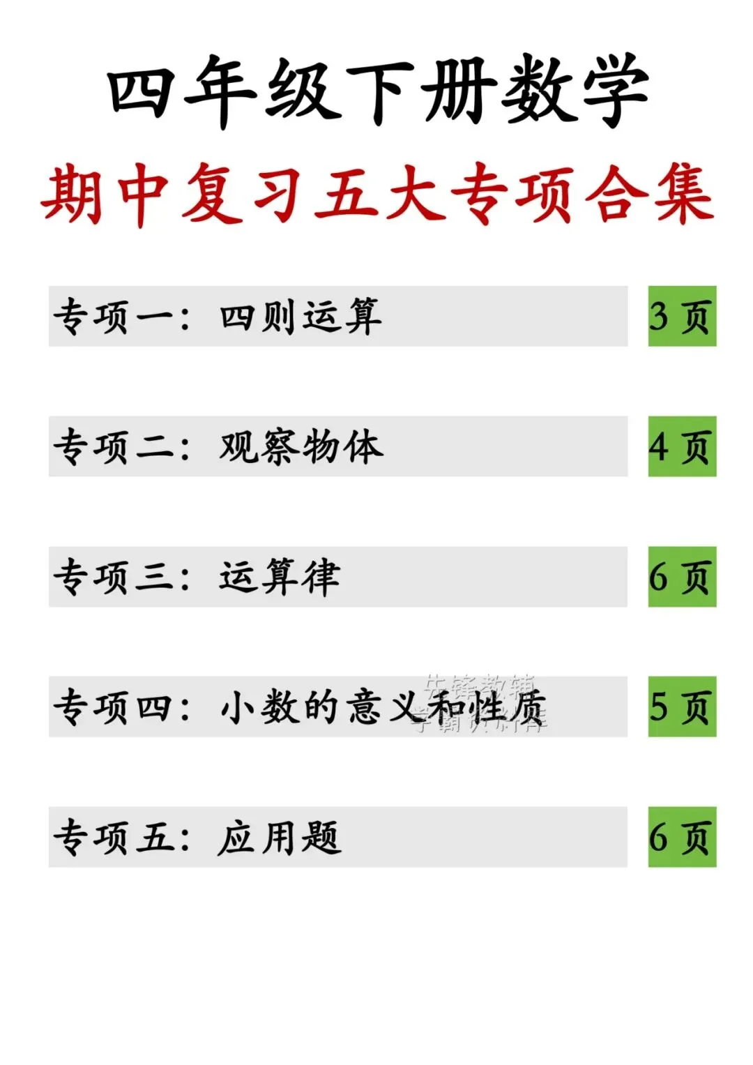 📚🔥26年新版四年级数学下册五大专项训练电子版可打印。为了帮孩子精准梳理知识、高效突破重难点,我特意整理了这份四年级下册数学期中复习五大专项合集,全面覆盖期中核心考点、易错题型与解题技巧,从基础计算到综合应用,层层递进、一站式通关,帮孩子筑牢基础、冲刺高分!