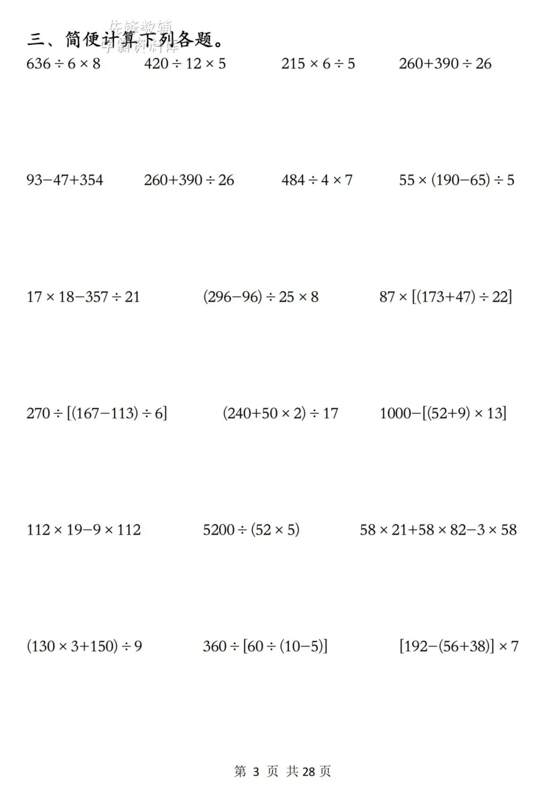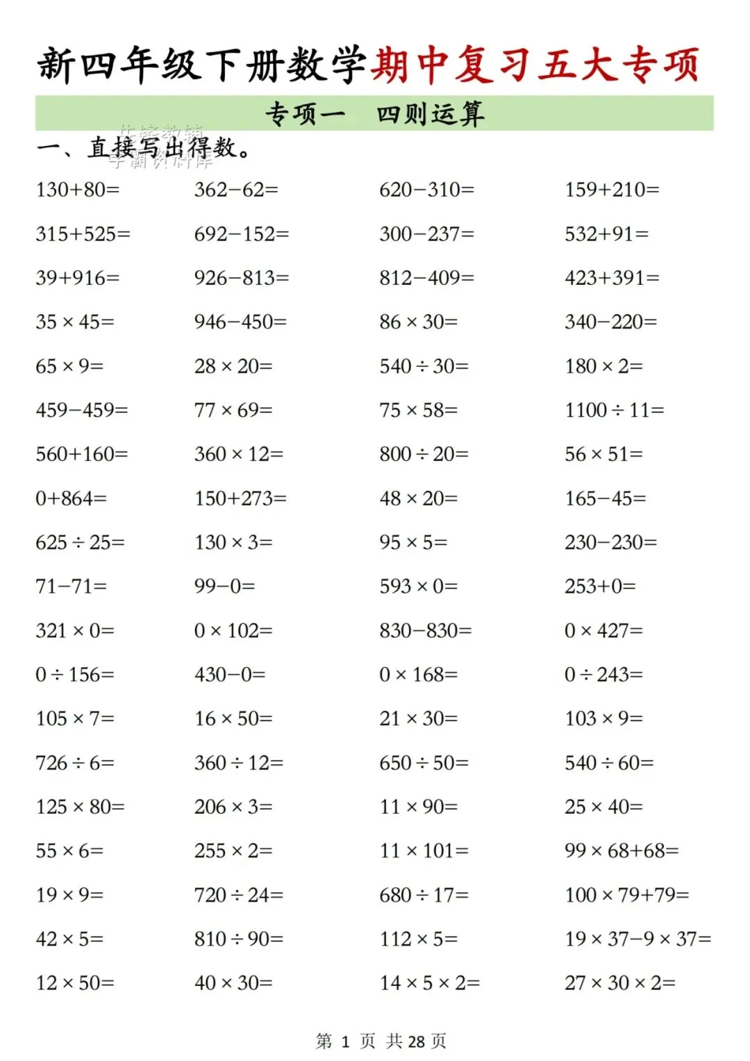 26年最新版《四年级数学下册期中复习五大专项训练》电子版可打印- 拷贝- 拷贝