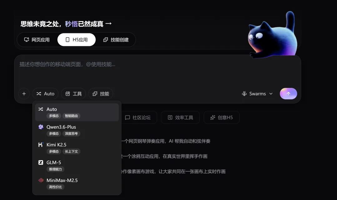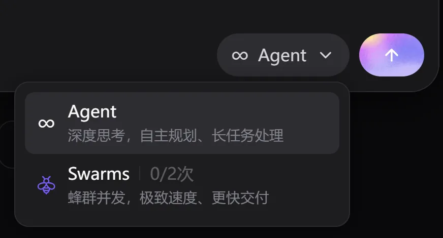 1. 创造模块——支持桌面端和移动端应用开发,提供Agent(深度思考)、Swarms(蜂群并行)两种模式。