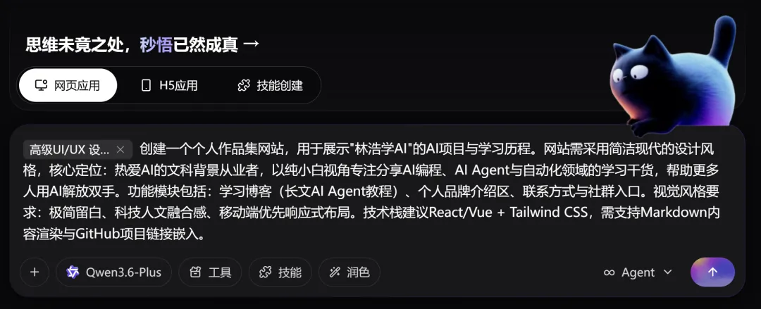 我亲自试了一下:输入”帮我做一个个人作品集网站,展示我的 AI 项目,风格要简洁现代”,选择 Qwen3.6-Plus 模型和 Agent 模式。