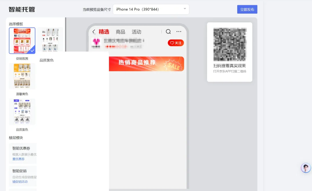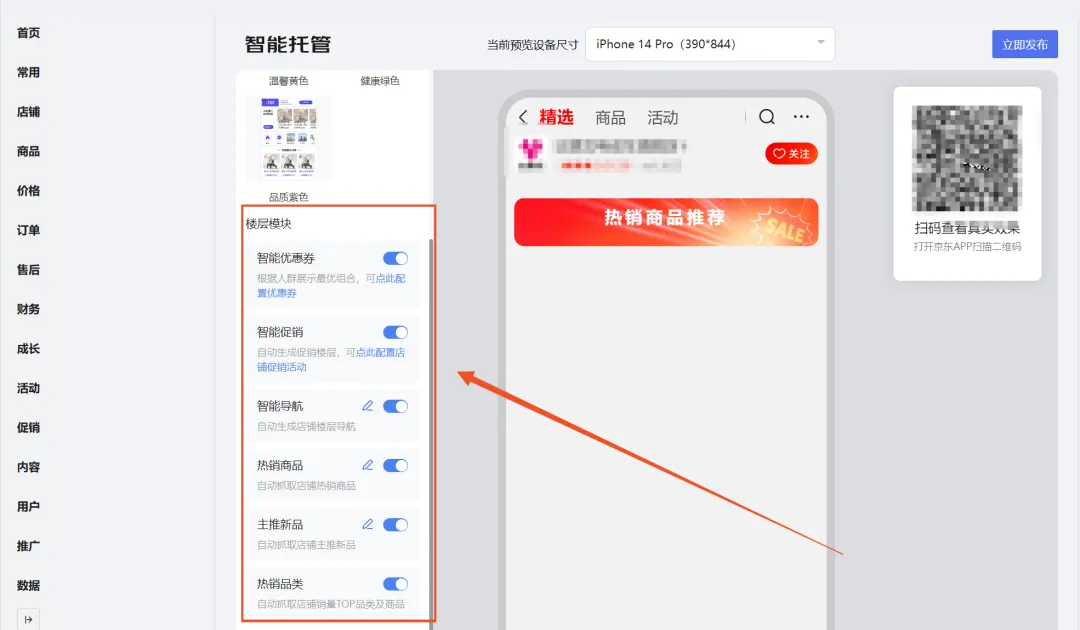 1、功能:装修分较低的商家,且没有过多时间精力投入在店铺首页精细化运营的商家。可托管给京东智铺系统进行自动化运营。