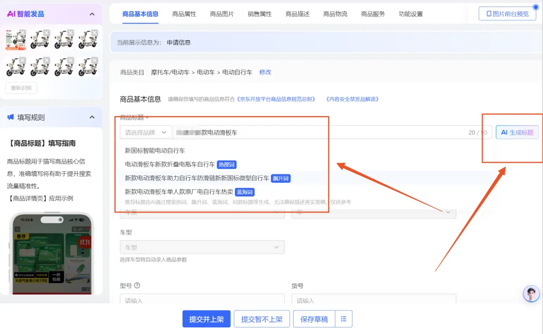 长标题——AI根据商品图片,预填长标题,点击填写框右侧按钮可以生成热搜词、飙升词、蓝海词等多个推荐长标题