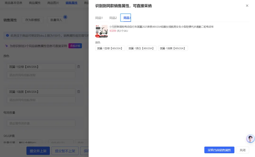 AI销售属性— AI根据商品图片自动关联相似度高的产品,可选择相似商品销售属性填写