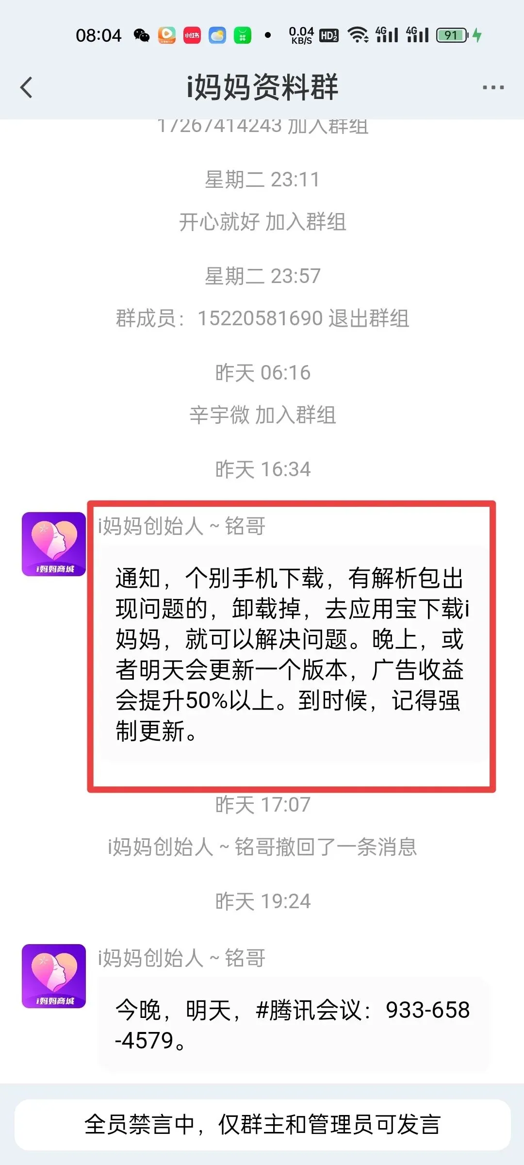 通知,个别手机下载,有解析包出现问题的,卸载掉,去应用宝下载i妈妈,就可以解决问题。晚上,或者明天会更新一个版本,广告收益会提升50%以上。到时候,记得强制更新。