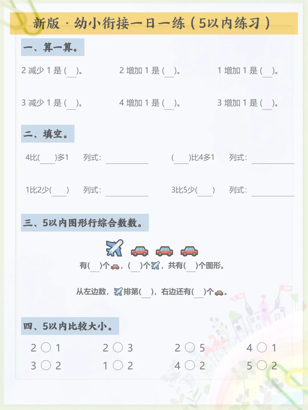 新版·幼小衔接一日一练(5以内练习)五,共5页,电子版可下载可打印,这份幼小衔接专项练习围绕5以内练习内容设计,帮助孩子在入学前进一步熟悉基础数学启蒙训练,逐步巩固相关认知与练习能力,内容贴近日常练习节奏,方便家长在家陪练、随时打印使用。需要的家长可以提前备好,让孩子每天练一练,轻松做好幼小衔接。