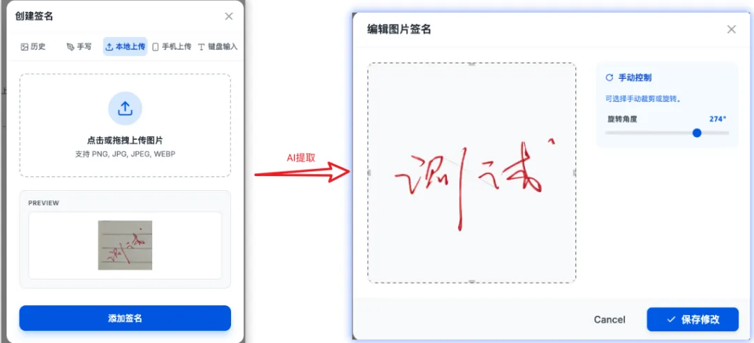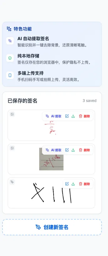 • AI 提取:上传一张纸上的签名照片,AI 自动去掉背景,只留下干净的签名笔迹