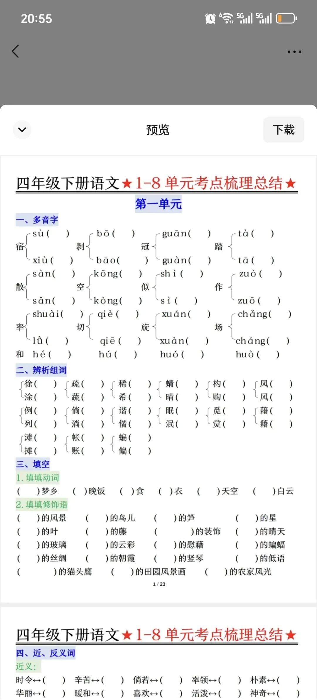 四年级下册语文1-8单元考点梳理(电子版可打印)